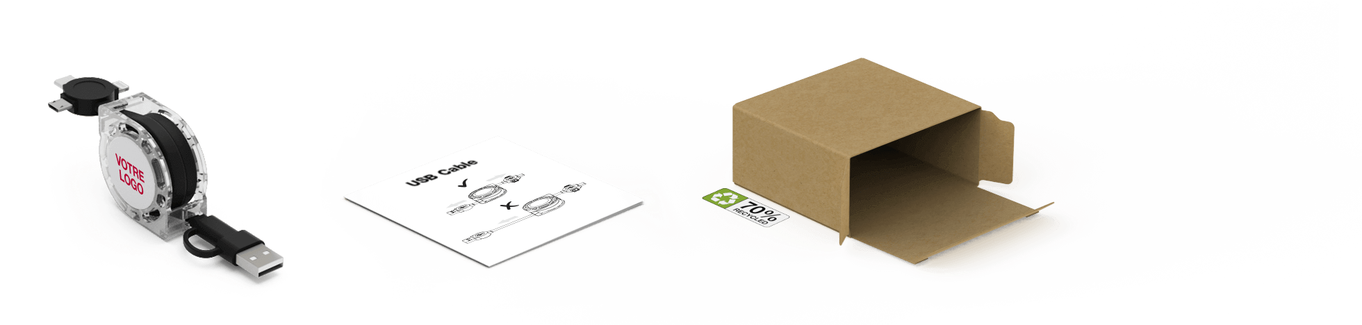 Le câble USB Motion dispose d'une grande zone de marquage sur les deux côtés, prêt à être imprimée avec votre image, logo, slogan, détails de l'événement et plus encore. Le Motion prend en charge les capacités de transfert et la fonction de chargement des appareils, il est compatible avec tous les principaux appareils grâce aux 4 options de connecteurs, y compris un connecteur USB standard, Micro-USB, USB-C et un adaptateur Lightning. Vous pouvez facilement prolonger et rétracter les câbles en tirant les deux extrémités du câble en même temps. Pour une touche de bois, découvrez notre modèle .