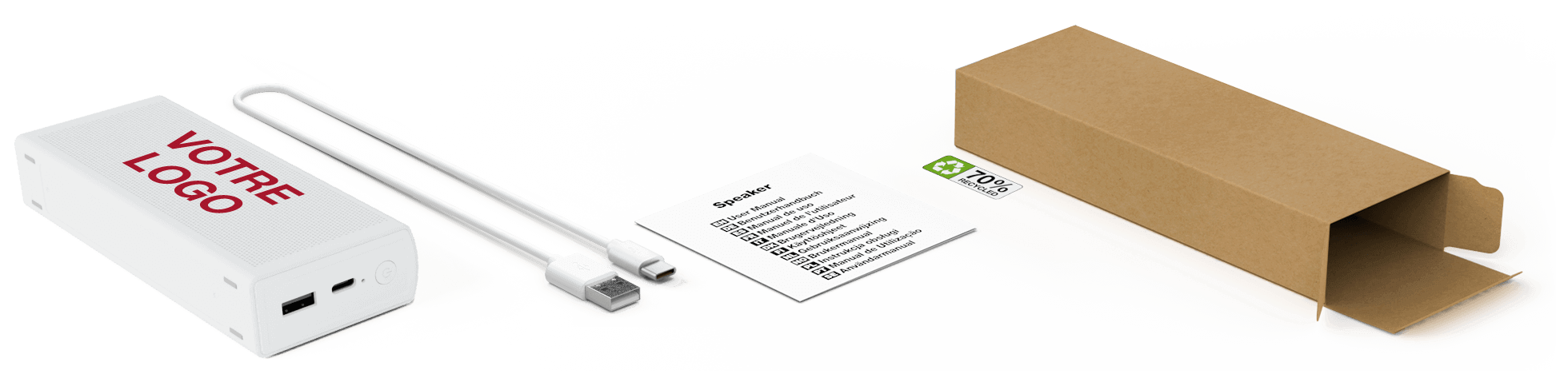 Avec une qualité de son stéréo impressionnante, cette enceinte Bluetooth® ; est bien plus qu'un simple matériel de marketing ! Offrant jusqu'à 10 heures de lecture de haute qualité, un microphone intégré et une fonction de banque d'énergie, c'est aussi un appareil audio de qualité et entièrement fonctionnel que vos clients et consommateurs vont adorer.