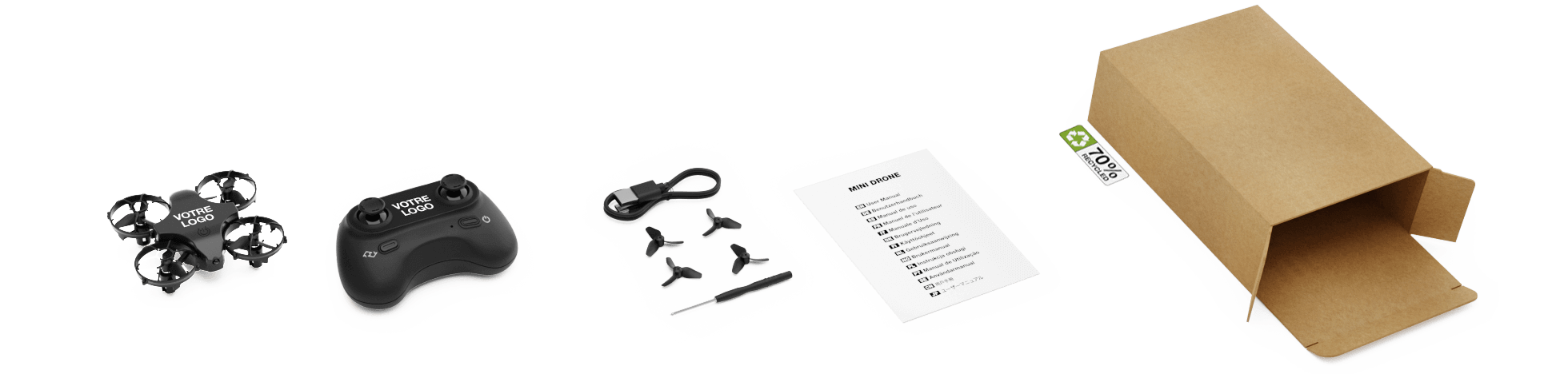 Le mini-drone Bee est entièrement fonctionnel et facile à contrôler, ce qui en fait un cadeau promotionnel amusant pour votre prochain salon, événement ou cadeau d'entreprise.
