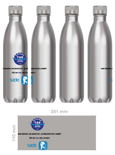 Nous pouvons marquer vos gourdes et tasses d'un visuel exceptionnel qui recouvre l'ensemble du corps de la gourde. Le résultat final est un produit extrêmement attrayant et percutant qui sera utilisé tous les jours et qui vous permettra de faire connaître votre marque de manière fantastique.