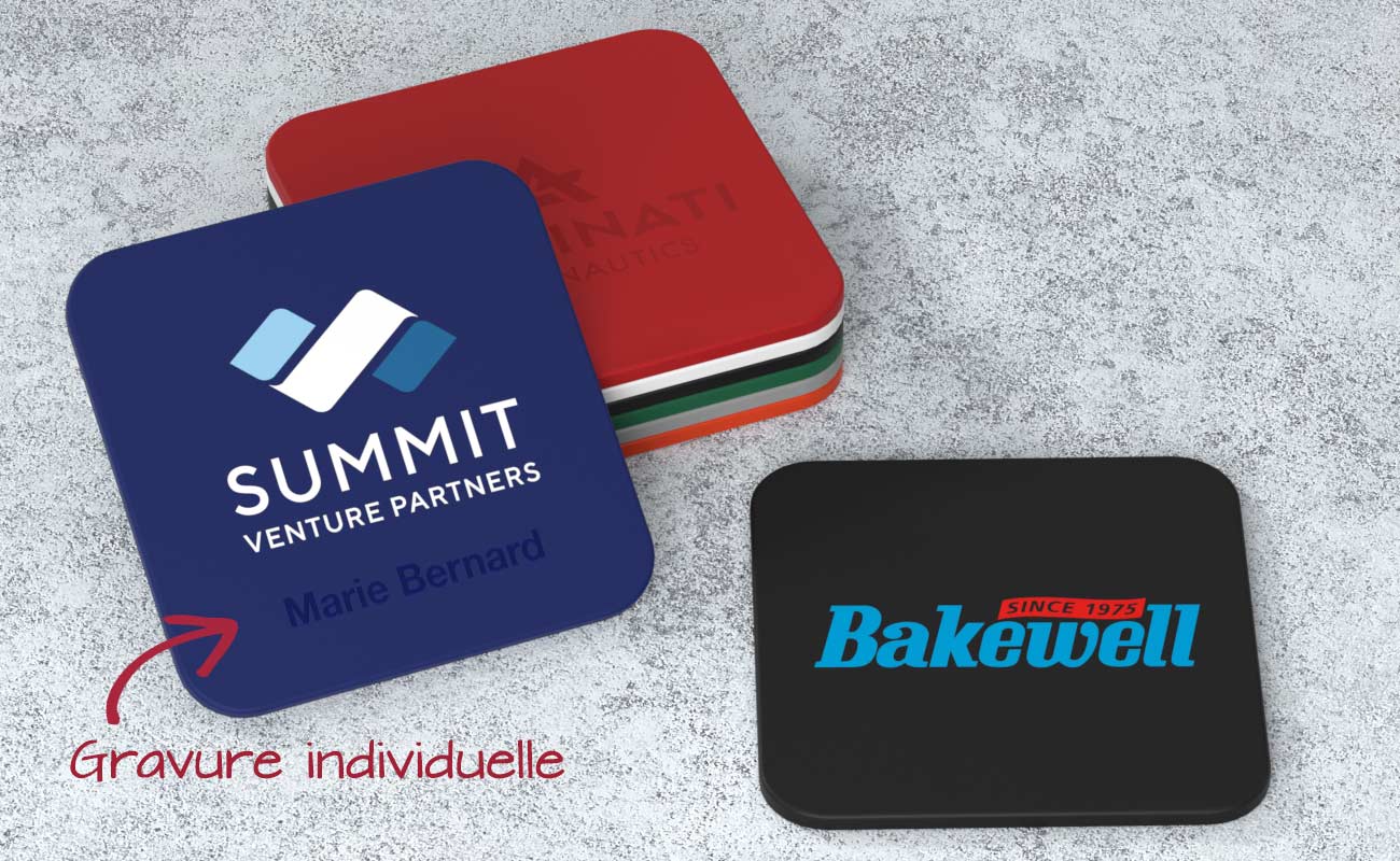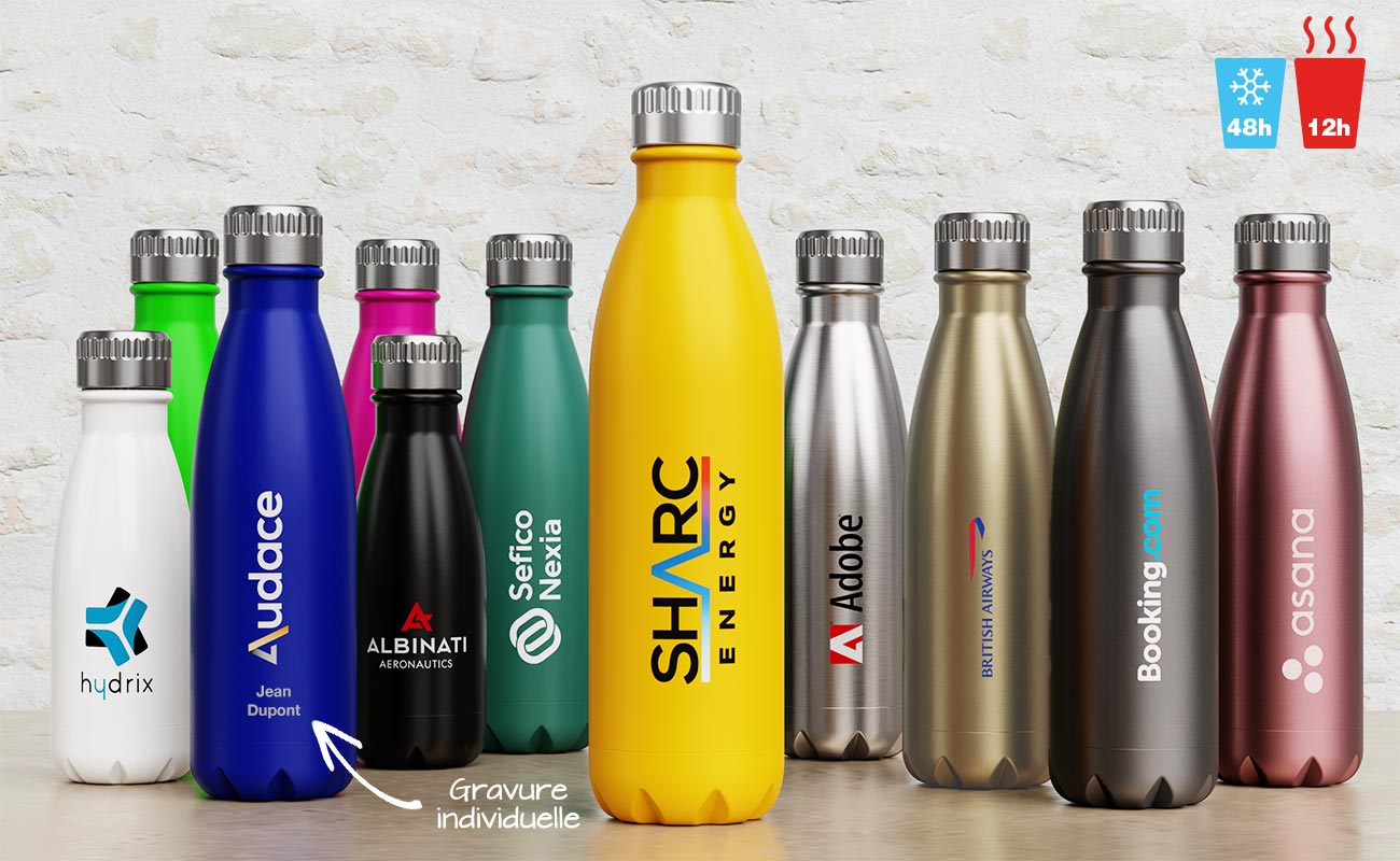La gravure permet de marquer de manière totalement indélébile vos noms/prénoms. Ce service est idéal pour les clubs sportifs et les écoles, car il permet d'éviter toute confusion potentielle entre les bouteilles d'eau ou les tasses pendant les entraînements ou les compétitions. Chaque nom accompagnera votre logo et votre slogan sur le produit.