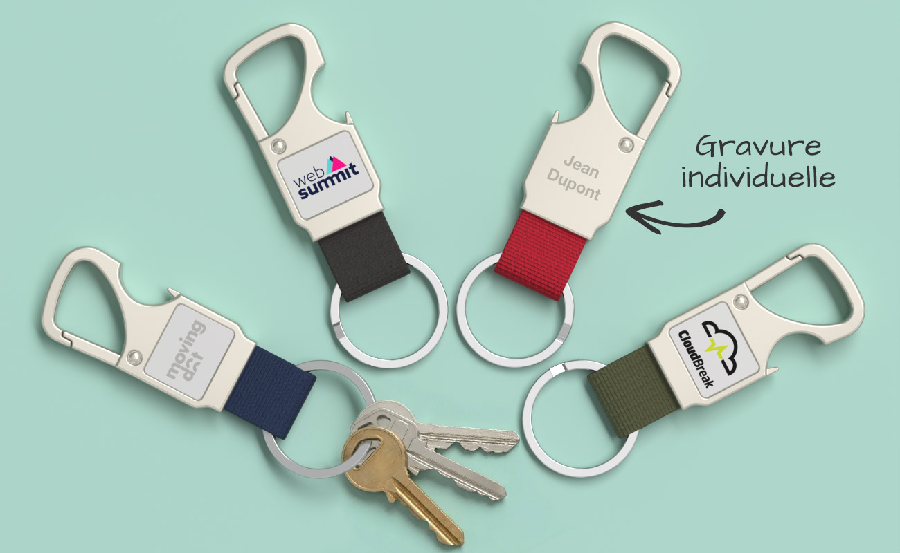 Cadeau promotionnel pratique et attrayant, notre porte-clés mousqueton HangOut allie fonctionnalité et impact pour votre image de marquage. Doté de deux zones de personnalisation et d'une lanière en tissu résistante, il est conçu pour mettre votre logo bien en évidence. Équipé d'un décapsuleur intégré, c'est un accessoire pratique que vos clients utiliseront encore et encore. Contactez-nous dès aujourd'hui pour connaître nos derniers tarifs, obtenir des échantillons et connaître nos délais de livraison express.
