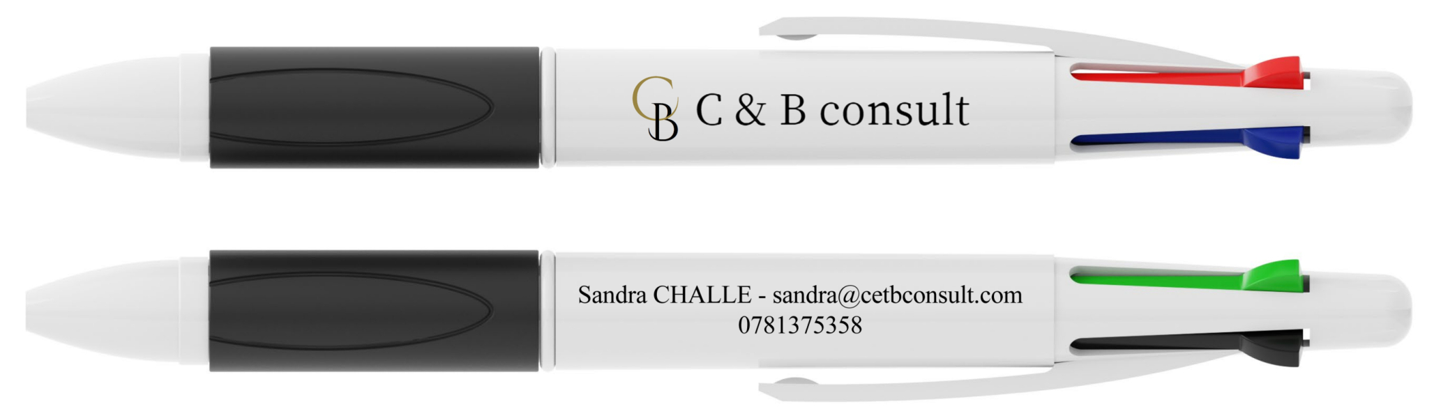 Le Quad est un stylo 4 couleurs, avec des billes bleues, rouges, vertes et noires. Chaque option de couleur s'ouvre et se rétracte grâce aux clics situés sur le dessus du stylo. La poignée confortable en caoutchouc thermoplastique est disponible dans une variété de couleurs pour compléter le marquage de votre marque. La coque extérieure blanche peut être imprimée avec votre logo, votre slogan et bien plus encore.