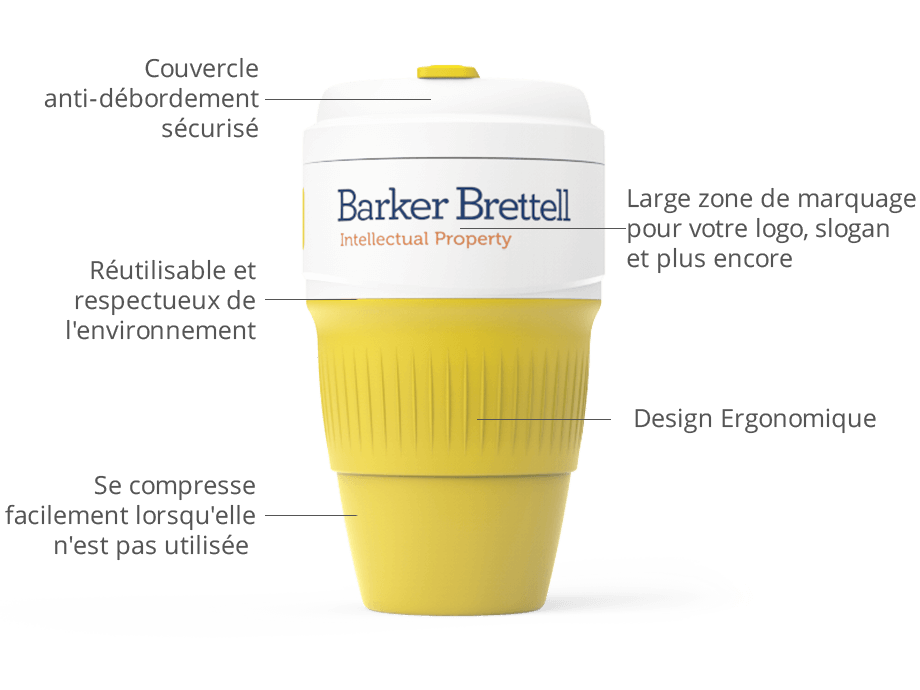 Votre logo, votre slogan et bien d'autres choses encore peuvent être sérigraphiés sur la grande surface d'impression du couvercle. Que la Tasse de voyage soit utilisée ou repliée pour être rangée, votre marque sera bien en vue pour augmenter sa visibilité.